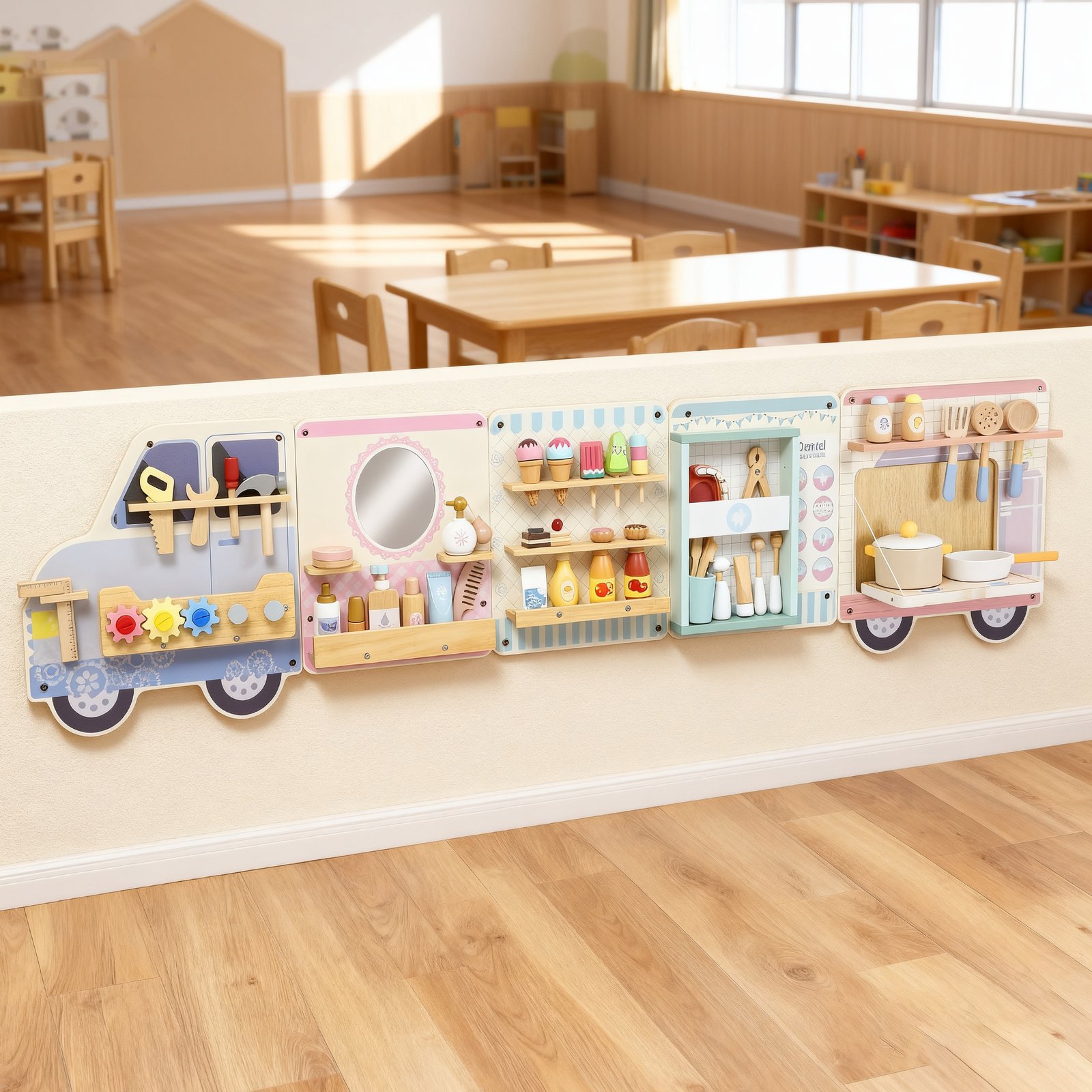 Fived themed sections on one large sensory wall, the busy board offers limitless entertainment for kids. They’ll immerse themselves in imaginative play through a tool bench, dessert shop, dentist and kitchen, whether alone or with friends and siblings. It’s a playful way to spend time while also developing logical thinking and fine motor skills for independent learning. Designed to save space by being wall-mounted, it can be easily placed anywhere for screen-free fun.